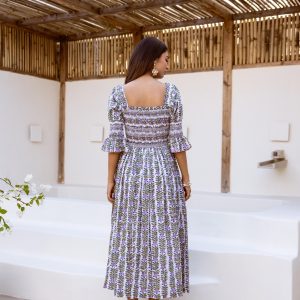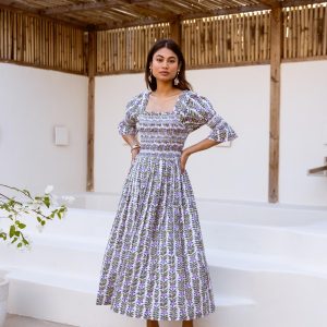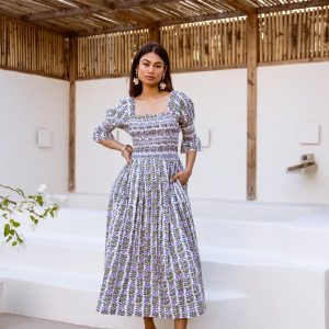 Crafted from breathable cotton and hand block-printed in vibrant, feel-good colors, this one’s made to brighten your day. The body features colorful smocking that hugs just right, while puff sleeves with matching smocked details add a fun, flirty touch. A square neckline keeps it sweet and structured, and yes—it has pockets.
